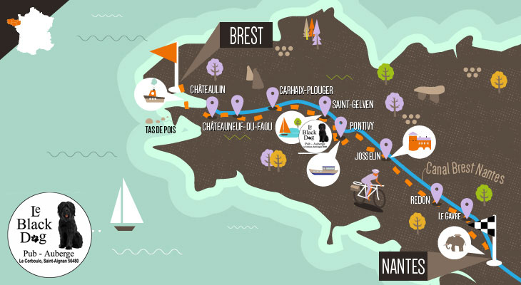 Le Black Dog Pub est est parfaitement positionné sur votre itinéraire. À mi-chemin entre Carhaix et Josselin, nous sommes à 450 m du chemin du canal. Nous avons hâte de vous rencontrer.